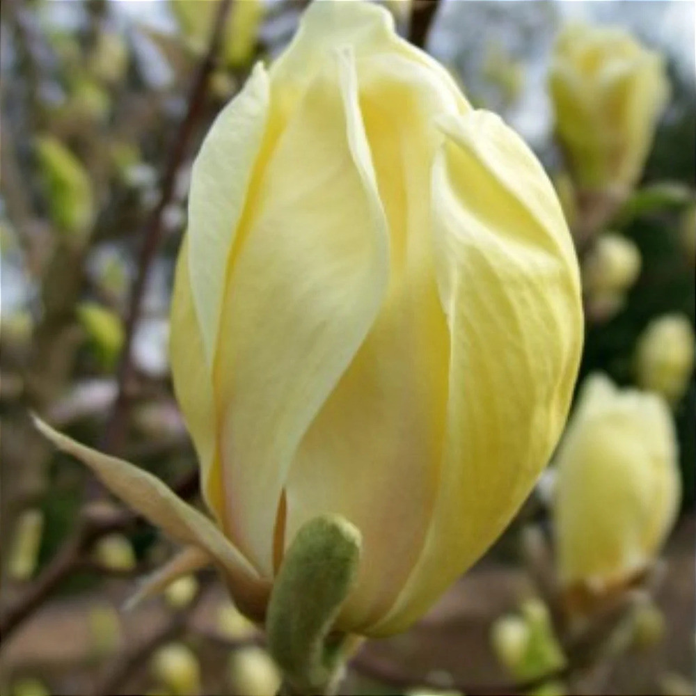 Virágzása tavasszal, általában április-május körül kezdődik, gyakran a lombfakadással egy időben vagy közvetlenül előtte. A virágok nagy méretűek, kehely vagy tulipán formájúak, színük világos sárga, néha enyhén zöldes árnyalattal. A szín visszafogottabb, mint a rózsaszín magnóliáké, de éppen ettől különleges.