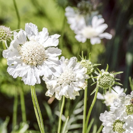 Virágai nagyobb méretűek, általában 6-8 cm átmérőjűek. Színük tiszta fehér, közepük enyhén domború, finoman rajzolt szerkezetű. A virágzás júniustól egészen szeptemberig tarthat, különösen ha az elnyílt virágokat eltávolítjuk.